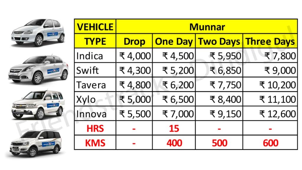 | Munnar to Thekkady | ₹2,500 – ₹3,500 |